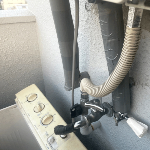 広島市中区舟入南のお客様で屋外の洗濯機蛇口辺りから水漏れの依頼をお受けいたしました。伺ってみると、給湯器と洗濯機の分岐金具からチョロチョロと水漏れしている状態でした。