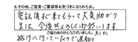 今回、トイレの水が出なくなり電話し対応して頂きました。長年のサビのつまりが原因でした。スピーディーに対応して頂き助かります。