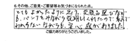 親切に対応していただき、部品の説明等していただきました。又、何か起こった時は御願いしたいと思います。
