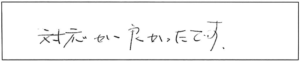 親切に対応していただき、部品の説明等していただきました。又、何か起こった時は御願いしたいと思います。