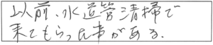 今回、トイレの水が出なくなり電話し対応して頂きました。長年のサビのつまりが原因でした。スピーディーに対応して頂き助かります。